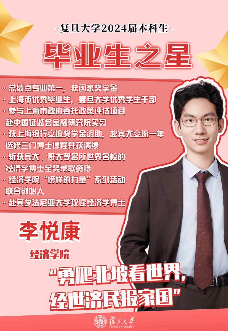近期,经老师评委和学生评委共同推荐,共产生10名复旦大学2024届本科生“毕业生之星”拟推荐人选,其中bat365在线登录网站注册赠送36李悦康同学成功入选。此外,侯佳宜同学获得复旦大学“毕业生之星”提名奖候选人。