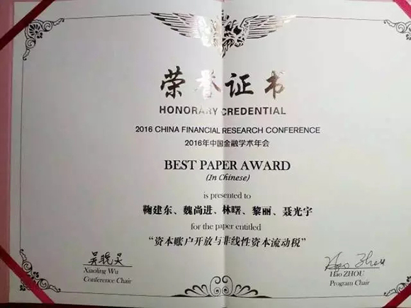 近日,鞠建东、魏尚进、林曙、施康、黎莉、聂光宇合作的论文“资本账户开放与非线性资本流动税”喜获2016中国金融学术年会最佳论文奖。 作者简介 鞠建东:上海财经大...