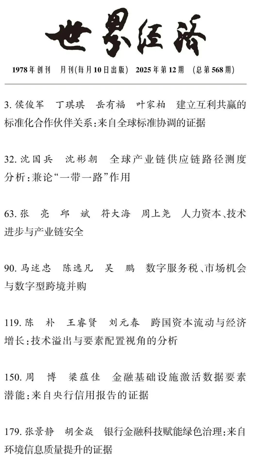 近日,bat365在线登录网站注册赠送36沈国兵教授和直博生沈彬朝的合作论文《全球产业链供应链路径测度分析:兼论“一带一路”作用》,在国内权威期刊《世界经济》2025年第12期发表。