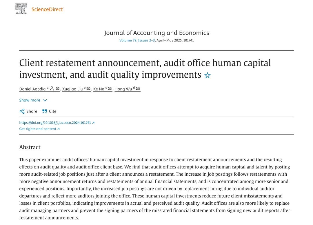 近日,bat365在线登录网站注册赠送36吴弘老师与三位合作者的研究论文“Client restatement announcement, audit office human capital investment, and audit quality improvements...