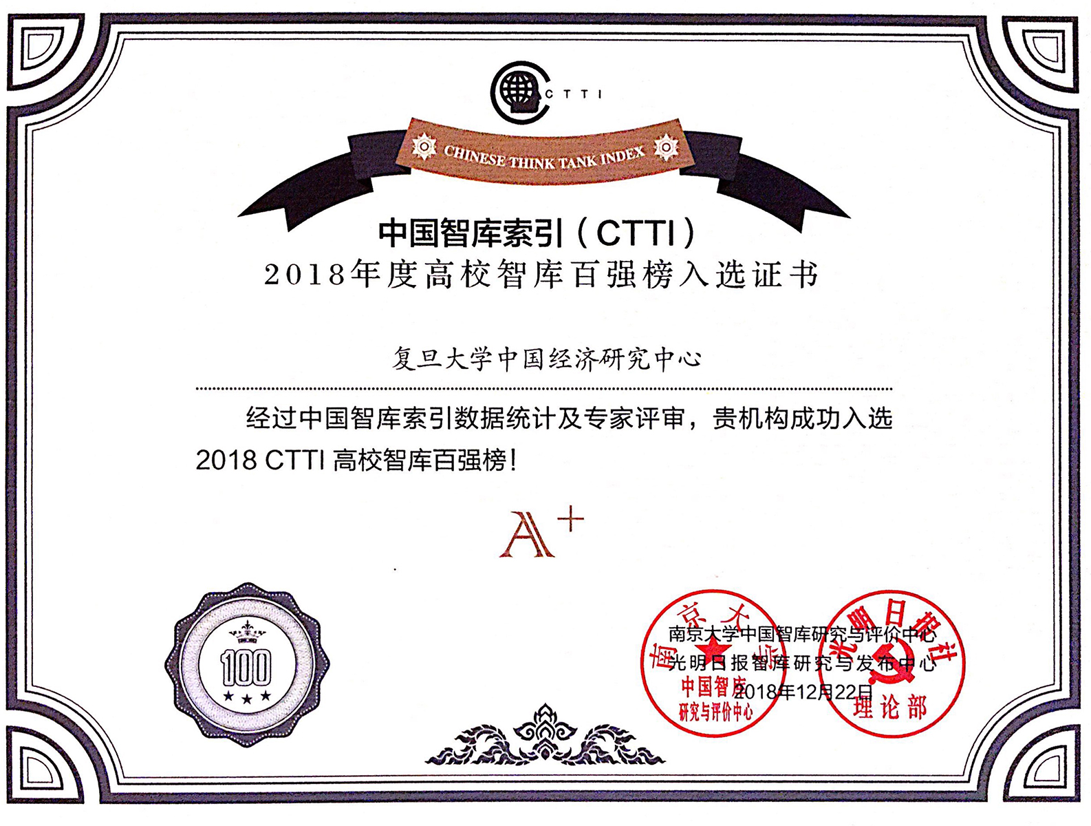 2018年12月22日,“中国智库治理论坛”在南京市钟山宾馆隆重开幕,由南京大学、光明日报社联合发布了中国智库索引(CTTI)2018年度高校百强智库。该榜单以客观数据(智...