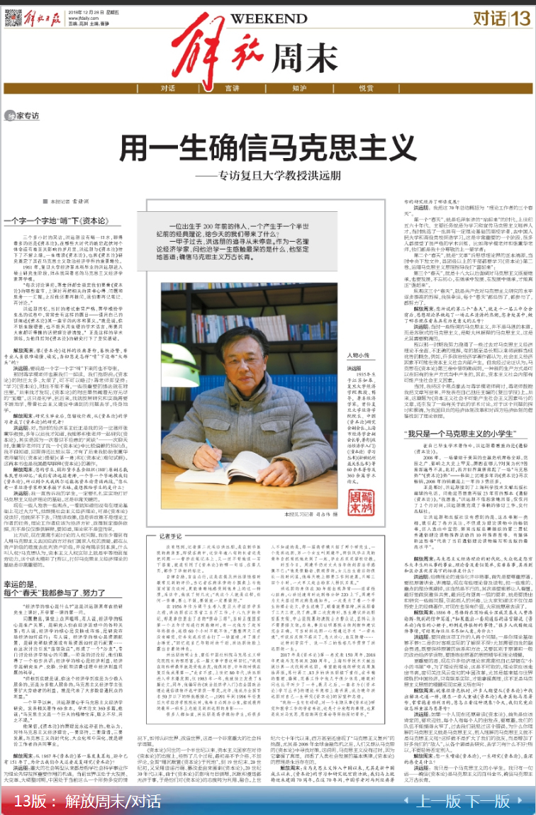 12月28日《解放日报》第13版”解放周末、对话“,整版刊登bat365在线登录网站注册赠送36洪远朋教授专访。 ■本报记者雷册渊 一位出生于200年前的伟人,一个产生于一个半世纪前的经典...