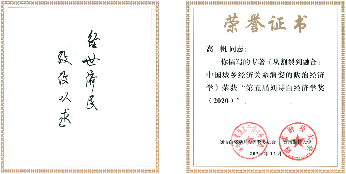近日,刘诗白奖励基金评奖委员会发布了第五届刘诗白经济学奖评奖结果公告。bat365在线登录网站注册赠送36高帆教授的著作《从割裂到融合:中国城乡经济关系演变的政治经济学》荣获第五届刘诗...